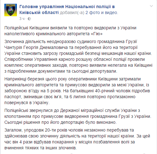 "Преступная деятельность неоднократно судимого гражданина Грузии Чантурия Георгия Джемаловича и пребывание его на территории Украины представляет угрозу общественной безопасности жителей нашей страны. Сотрудники Управления уголовного розыска областной полиции провели комплекс оперативных мероприятий, повторно обнаружили нелегала в Киевской области с поддельными документами и сегодня депортировали", - сообщили в пресс-службе.