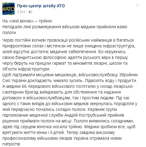 Недалеко от линии разграничения в зоне АТО украинским военным медикам пришлось принимать преждевременные тяжелые роды. Об этом сообщает пресс-центр штаба АТО.