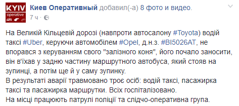 В Киеве на Большой Кольцевой дороге, напротив автосалона Toyota, водитель такси Uber не справился с управлением  врезался в маршрутку с пассажирами. Об этом в Facebook сообщает "Киев Оперативный".