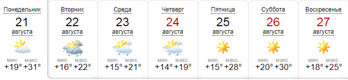 Ресурс Мeteoprog.ua также пишет, что с +32 в понедельник температура упадет до +18...+24 в середине недели и вновь поднимется к отметке +31 только в воскресенье. Дожди прогнозируют 22, 24 августа и на выходных 26-27-го.