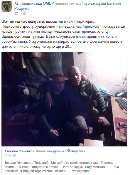 "Убит во время отпуска, дома, на мирной территории... Невысокого роста, худощавый - он водил нас по "промке", показывал где лучше пройти и на какой позиции обитают самые геройские ребята. Казалось, знал здесь всех. Очень коммуникабельный, приветливый, хотя и застенчивый. У журналистов соберется много фрагментов видео с этим мальчуганом, которому не было еще и 20...", - говорится в сообщении.