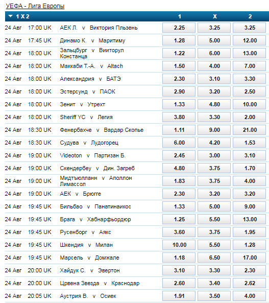 Все ставки на ответные матчи плей-офф Лиги Европы, 24 августа