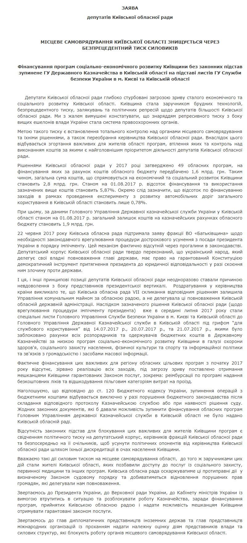 "Депутаты Киевского областного совета глубоко обеспокоены угрозой срыва устойчивого экономического и социального развития Киевской области. Киевщина стала заложником грязных технологий, беспрецедентного давления, запугивания и политических репрессий в отношении депутатов большинства Киевского областного совета. Мы с сожалением вынуждены констатировать, что орудием репрессивного давления со стороны высших эшелонов власти Украины стала система правоохранительных органов", утверждают депутаты.