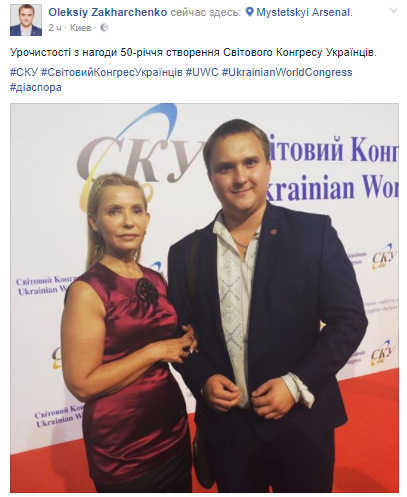 Лидера "Батькивщины" Юлию Тимошенко сфотографировали в красном облегающем платье на мероприятии по случаю 50-летия создания Всемирного конгресса украинцев. Фото с политиком разместил общественный активист Алексей Захарченко на своей странице в Facebook.