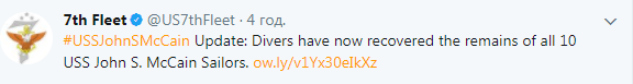 Водолазы нашли тела всех пропавших без вести моряков с ракетного эсминца "John S. McCain", который столкнулся с танкером у берегов Сингапура.