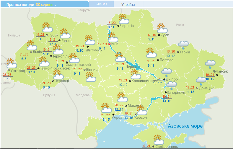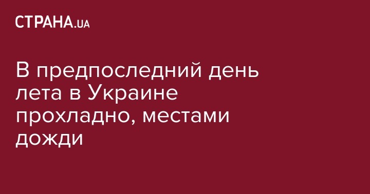 В среду, 30 августа, в Украине сохранится прохладная, как для лета, погода. Местами ожидаются дожди. Об этом говорит прогноз Укргидрометцентра.