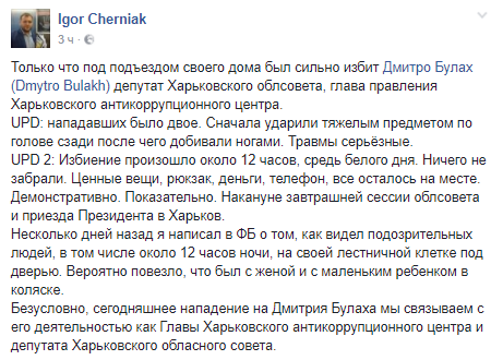 Член "Харьковского антикоррупционного центра" Игорь Черняк на своей странице в Facebook рассказал подробности нападения на депутата Харьковского облсовета Дмитрия Булаха. По словам Черняка, неизвестные избили Булаха возле подъезда его дома, нанеся серьезные ушибы и перелом ребер.