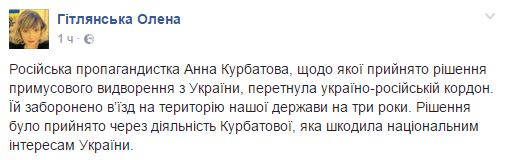 "Российская пропагандистка Анна Курбатова, в отношении которой принято решение о принудительном выдворении из Украины, пересекла украинско-российскую границу. Ей запрещен въезд на территорию нашего государства на три года", - написала спикер СБУ на странице в Facebook в среду вечером.