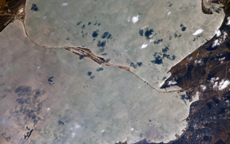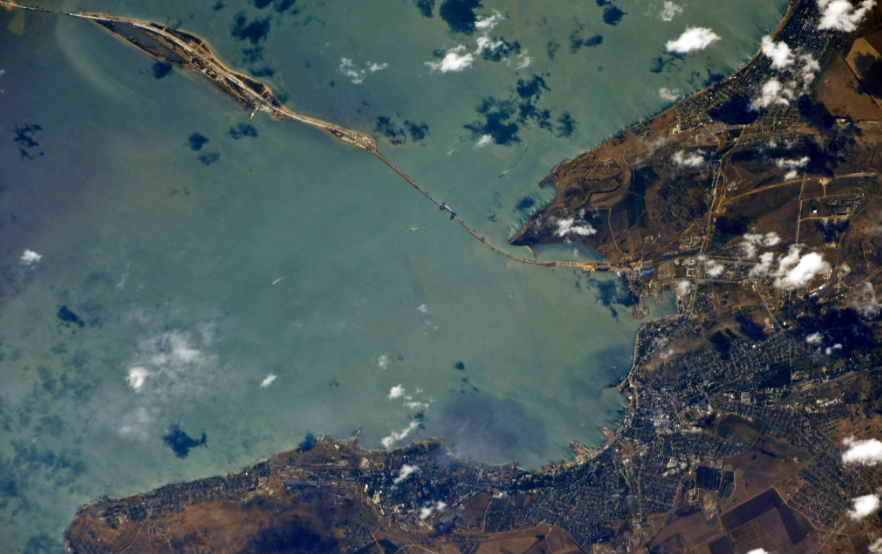 Бортинженер 52-го экипажа МКС Сергей Рязанский обнародовал в Twitter фото строящегося Керченского моста, снятое из космоса.