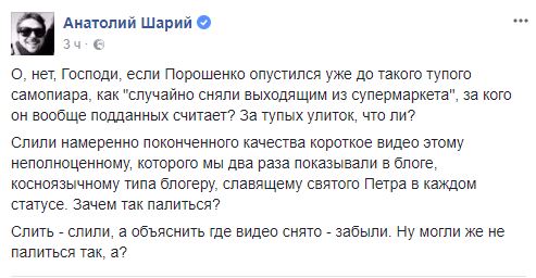 Видеоблогер Анатолий Шарий считает, что видео постановочное и недоумевает - на кого расчитан такой низкопробный пиар: "Если Порошенко опустился уже до такого тупого самопиара, как "случайно сняли выходящим из супермаркета", за кого он вообще подданных считает? За тупых улиток, что ли?".