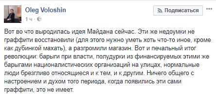 "Вот во что выродилась идея Майдана сейчас. Эти же недоумки не граффити восстановили (для этого нужно уметь хоть что-то иное, кроме как дубинкой махать), а разгромили магазин. Вот и печальный итог революции: барыги при власти, полудурки из финансируемых этими же барыгами националистических организаций на улицах, нормальные люди брезгливо относящиеся и к тем, и к другим. Ничего общего с настроением и духом того периода, когда появились эти сами граффити, это не имеет", - написал Олег Волошин.