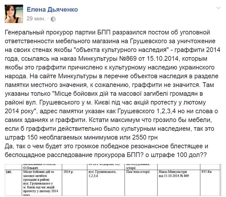 "Генеральный прокурор разразился постом об уголовной ответственности мебельного магазина на Грушевского за уничтожение на своих стенах якобы "объекта культурного наследия" - граффити 2014 года, ссылаясь на наказ Минкультуры №869 от 15.10.2014, которым якобы это граффити причислено к культурному наследию украинского народа. На сайте Минкультуры в перечне объектов наследия в разделе памятки местного значения, к сожалению, граффити не значится. Там указаны только "Місце бойових дій та масової загибелі громадян в районі вул. Грушевського у м. Києві під час акцій протесту у лютому 2014 року", адрес объекта указан как Грушевского 1,2,3,4. Но ни слова о граффити. Кстати максимум что грозило бы мебели, если б граффити действительно было культурным наследием, так это штраф 150 необлагаемых минимумов или 2550 грн. Да, так о чем будет это громкое победное резонансное блестящее и беспощадное расследование прокурора БПП? О штрафе в 100 дол?", - написала в своем посте юрист.
