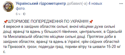 "4 сентября в западных областях сильные, ночью местами очень сильные дожди, утром и днем в большинстве северных, центральных, в Одесской и Николаевской областях местами сильные дожди. В течение суток в западных областях, утром и днем в Украине, кроме восточных областей и Приазовья, грозы, град, порывы ветра и шквалы 15-20 м/с", - говорится в сообщении.