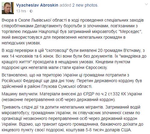 В городе Сколе Львовской области задержали микроавтобус, в котором нелегально перевозили 20 граждан Вьетнама. Об этом сообщил замглавы Национальной полиции Вячеслав Аброськин на своей странице в Facebook.