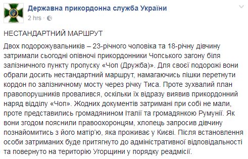 "Двух путешественников – 23-летнего мужчину и 18-летнюю девушку задержали сегодня в полночь пограничники Чопского отряда возле железнодорожного пункта пропуска", - говорится в сообщении.