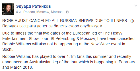 Запланированный на 10 сентября в Москве концерт мировой поп-звезды Робби Уильямса не состоится. Об этом сообщил представитель организаторов приезда певца в Россию в Fаcebook Эдуард Ратников.