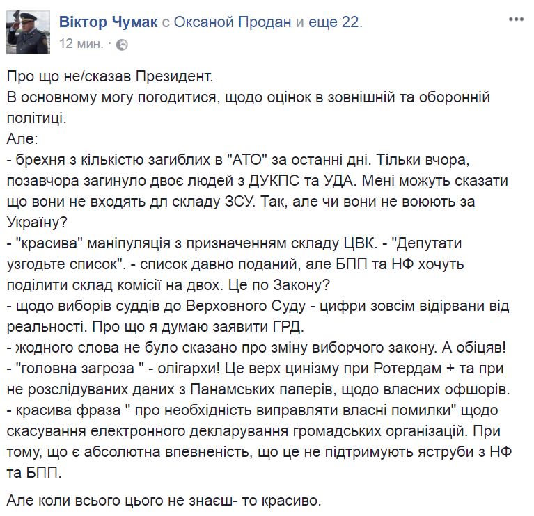 Народный депутат Виктор Чумак (внефракционный) заявил, что президент Петр Порошенко в своем выступлении не коснулся ряда важных тем. Об этом нардеп написал на своей странице в Facebook.
