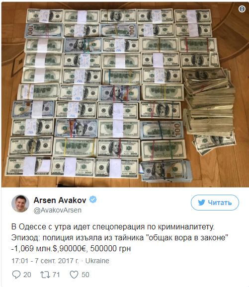 "В Одессе с утра идет спецоперация по криминалитету. Эпизод: полиция изъяла из тайника "общак вора в законе" - 1,069 млн $, 90000 евро, 500 000 грн", - написал Аваков.