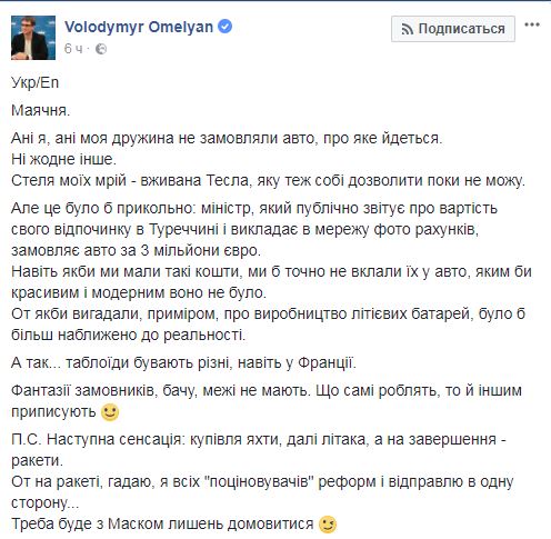 "Бред. Ни я, ни моя жена не заказывали авто, о котором идет речь. Ни какое-либо другое. Потолок моих мечтаний - подержанная Tesla, которую тоже себе позволить пока не могу", - заявил министр.