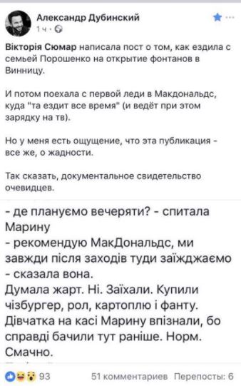 Однако нашлись те, кто решил защитить жену гаранта от нападок. Так, народный депутат Виктория Сюмар ("Народный фронт") написала в Facebook, что для Марины Порошенко появляться в публичных местах - обыденность. Для примера Сюмар рассказала, что супруга президента ездила с ней в МакДональдс и лично делала заказ.