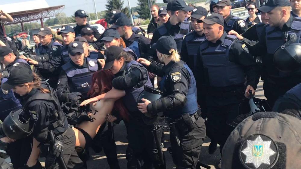 Она оголила грудь и подняла портреты Порошенко и Саакашвили с надписью "Fools without borders" ("Дураки без границ"). Тот же слоган она начала и громко выкрикивать.