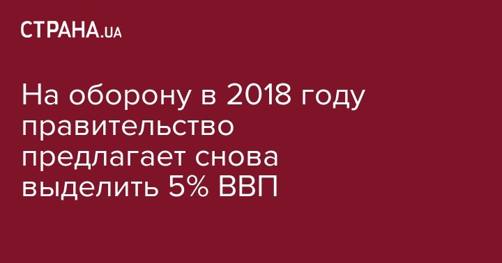 В проекте государственного бюджета Украины на 2018 год правительство предлагает снова выделить 5% ВВП на финансирование оборонной сферы, как и в 2017 году. Об этом сообщил министр финансов Украины Александр Данилюк, пишут "Украинские новости".
