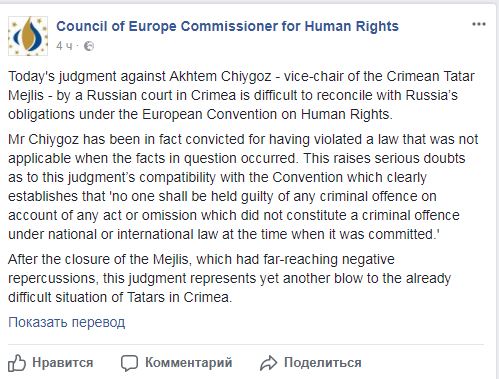 "Сегодняшнее решение в отношении Ахтема Чийгоза, заместителя председателя Меджлиса крымских татар, вынесенное российским судом в Крыму, трудно сочетается с обязательствами России по Европейской конвенции о правах человека", - пишет комиссар.