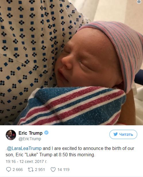 "Лара Трамп (жена Эрика Трампа – Ред.) и я счастливы сообщить о появлении на свет нашего сына, Эрика Люка Трампа, который родился в 8.50 сегодня утром (15.50 киевского времени)",  - написал Эрик Трамп.