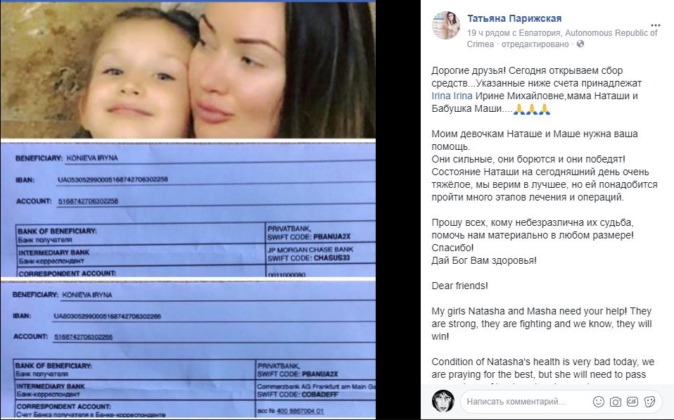 Деньги можно передать на карты Ирины Коневой, мамы пострадавшей. "ПриватБанк" (гривна) 5363542306739328 и "Сбербанк России" (рубль) 4276380043663850.