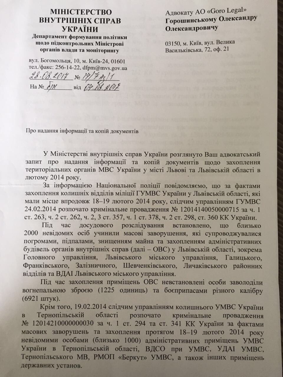 В ответе МВД Украины на адвокатский запрос сообщается, что в течение 18-19 февраля 2014 около 2000 неизвестных завладели в районных отделах милиции ГУ МВД Украины во Львовской области и ГАИ Львовского горуправления 1225 единицами огнестрельного оружия и боеприпасов различного калибра.