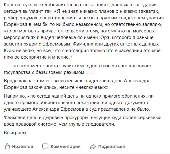 "Напомню, - по сегодняшний день ни одного прямого обвинения, ни одного прямого обвинительного показания, ни одного документа, уличающего Александра Ефремова в суд представлено не было", - подчеркивает Смирнов и добавляет, что это "фейковое дело и дырявые прокуроры, несущие куда более серьезный вред правовой системе, чем глупые следователи".