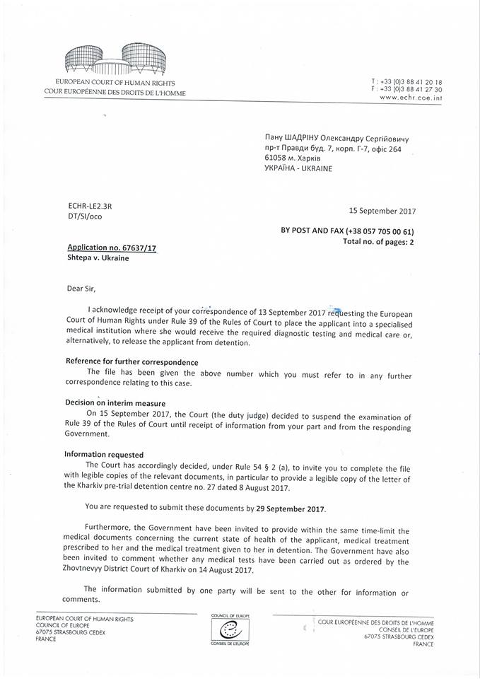 "Европейский суд по правам человека запросил информацию у правительства Украины по моему обращению, поданному позавчера в порядке Правила 39 Регламента Суда о текущем состоянии здоровья Штепы Нели Игоревны, а также о состоянии выполнения определения Октябрьского районного суда города Харькова об оказании медицинской помощи (диагностике и лечении)", - написал Шадрин.
