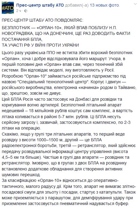 В зоне АТО упал беспилотник "Орлан" российского производства. Об этом сообщает пресс-центр штаба АТО на своей странице в Facebook.
