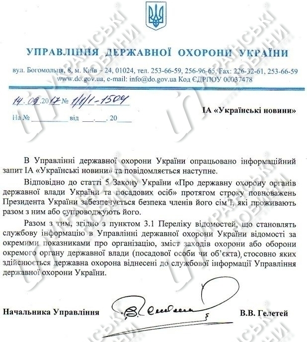 В то же время, в Управлении государственной охраны изданию подтвердили, что Марина Порошенко является охраняемым лицом согласно нормам Закона "О государственной охране органов государственной власти Украины и должностных лиц". При этом, согласно этому же Закону, сведения об организации охраны и количестве задействованных в ней сотрудников УДО отнесены к информации с ограниченным доступом.