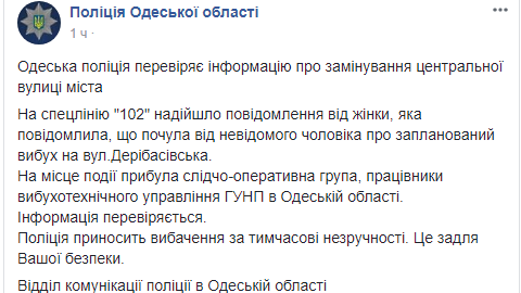 На спецлинию "102" позвонила женщина, которая сообщила, что услышала от неизвестного мужчины о запланированном взрыве на ул. Дерибасовская.