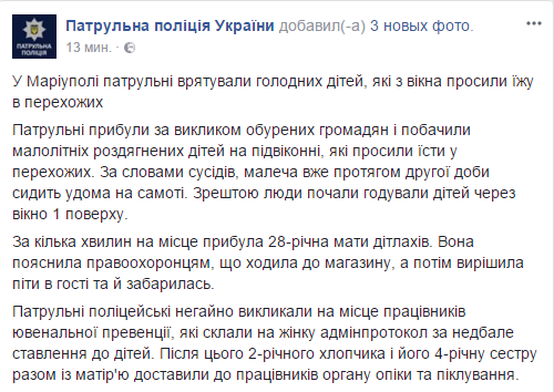 В Мариуполе патрульные спасли голодных детей, которые из окна просили еду у прохожих. Об этом сообщает патрульная полиция Украины в Facebооk.