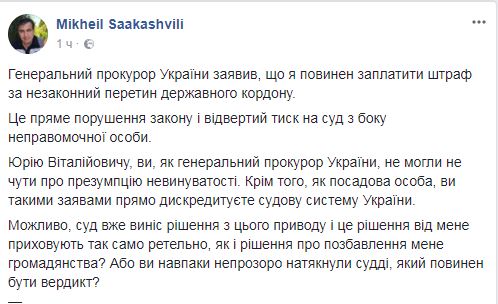 "Генеральный прокурор Украины заявил, что я должен заплатить штраф за незаконное пересечение государственной границы. Это прямое нарушение закона и откровенное давление на суд со стороны неправомочного лица", – написал Саакашвили.