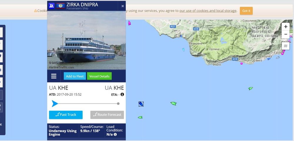 Так, вчера днем около 15.00, теплоход вышел из порта приписки Херсон. Никаких круизов в данное время года заявлено не было. Владельцем значится все та же круизная компания "Червона Рута", что и в случае с теплоходом "Генерал Ватутин".