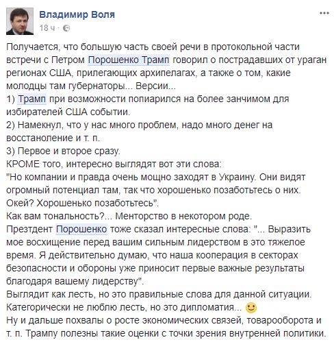 "Блестяще отработанная Порошенко роль в рамках пиар-стратегии команды Трампа по спасению находящегося в кризисе президентства. Тут и о созданных от выросшей взаимной торговли сотнях тысяч рабочих мест (где только они?!) и обещание защищать американских инвесторов, и, конечно, восхищение "сильным лидерством" лично Трампа в борьбе с последствиями ураганов. Вот президент США этот пас прекрасно поймал и подробно рассказал о геройствах спасателей Техаса и Флориды. Зачем в такой приятной беседе вообще вспоминать о России и прочих неприятных вещах. Это ж только дома президент ни одну речь без упоминания агрессора сказать не может, а в США всегда, видимо, просят не сквернословить при Дональде", - написал он.
