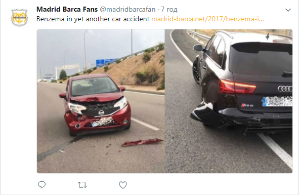 Знаменитый нападающий "Реала" Карим Бензема попал в довольно опасную аварию, сообщает Twitter фан-клуба команды. Он лоб в лоб столкнулся с другим автомобилем.