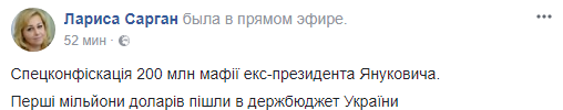 В государственный бюджет Украины поступили первые миллионы долларов из спецконфискации банковских активов экс-президента Виктора Януковича. Об этом в Facebook сообщила пресс-секретарь генпрокурора Лариса Сарган.