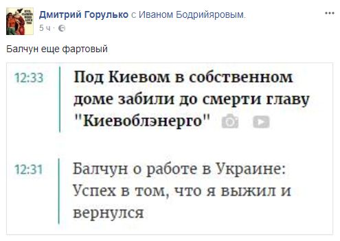 Журналист Дмитрий Горулько напомнил о сегодняшнем откровении экс-главы "Укрзализныци" Войцеха Балчуна, который накануне порадовался, что остался жив, работая в Украине. "Балчун еще фартовый", - написал Горулько и добавил скриншот из ленты новостей.