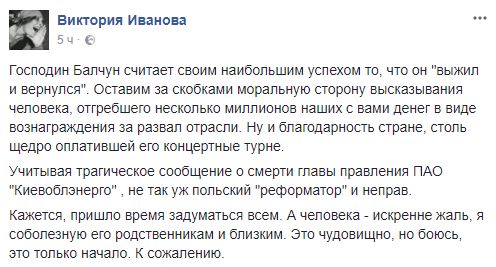 Пользователь Facebook Виктория Иванова также вспомнила о Балчуне: "Господин Балчун считает своим наибольшим успехом то, что он "выжил и вернулся". Оставим за скобками моральную сторону высказывания человека, отгребшего несколько миллионов наших с вами денег в виде вознаграждения за развал отрасли. Ну и благодарность стране, столь щедро оплатившей его концертные турне.