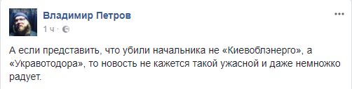 Блогер Владимир Петров опубликовал весьма циничный пост: "А если представить, что убили начальника не "Киевоблэнерго", а "Укравотодора", то новость не кажется такой ужасной и даже немножко радует".
