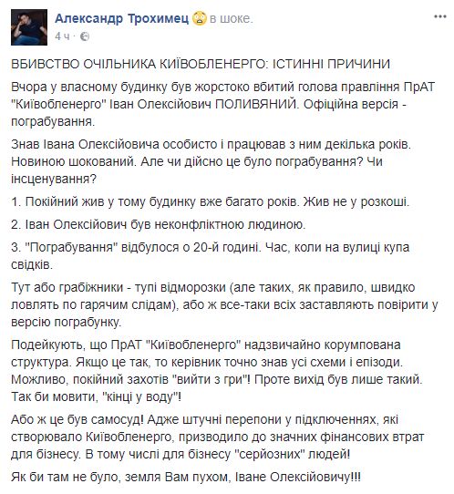 Александр Трохимец, руководитель ОО "Киевская региональная энергетическая ассоциация": "Убийство главы Киевоблэнерго: истинные причины. Вчера в собственном доме был жестоко убит председатель правления ЧАО "Киевоблэнерго" Иван Алексеевич Полывяный. Официальная версия - ограбление.