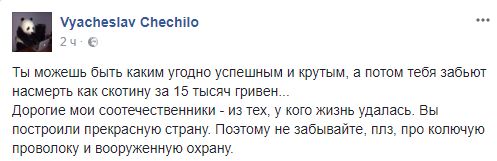 Журналист Вячеслав Чечило: "Ты можешь быть каким угодно успешным и крутым, а потом тебя забьют насмерть как скотину за 15 тысяч гривен... Дорогие мои соотечественники - из тех, у кого жизнь удалась. Вы построили прекрасную страну. Поэтому не забывайте, плз, про колючую проволоку и вооруженную охрану".