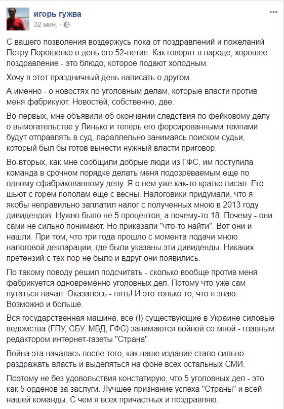 Против главного редактора интернет-издания "Страна" Игоря Гужвы власти фабрикуют одновременно сразу пять уголовных дел. Об этом Игорь Гужва сообщил в Facebook.