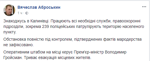 Правоохранители контролируют ситуацию в населенном пункте Калиновка, рядом с которым с вечера, 26 сентября взрываются склады с боеприпасами. Об этом сообщил первый замглавы Нацполиции Вячеслав Аброськин в Facebook.