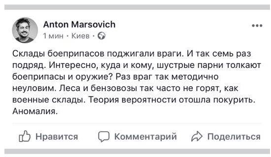 "Это точно диверсия. В связи с этим, и нашими разведданными еще с 25 числа в Винницкой области под видом антитеррористических учений были проведены обыски и преследования диверсионных групп. Да, это дело не одного человека. И два дня проходили поиски и ведение этих групп. Основная масса их была задержана. Основная масса, но не все. Поэтому одна группа смогла доставить на беспилотнике взрывное устройство", – написал в Facebook сотрудник Главного управления развития и сопровождения материального обеспечения ВСУ Сергей Мисюра.