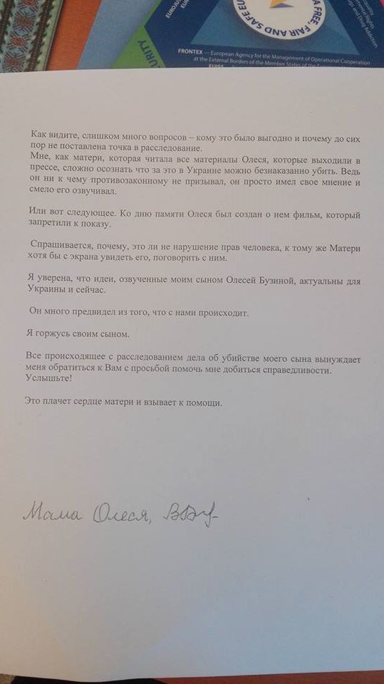 Письмо мамы Олеся Бузины. Фото: Оксана Челышева/Facebook